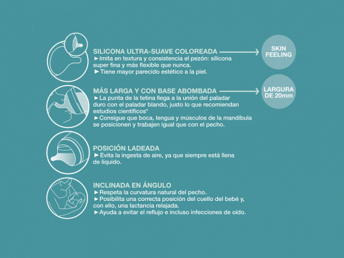 La seva tetina de silicona imita el pit matern i incorpora una bossa anticòlic que evita l'entrada d'aire, ajudant a reduir els còlics gasosos del bebè.