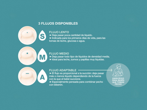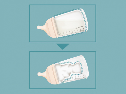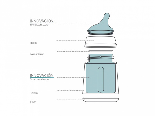 • Sense necessitat d'aire exterior per a compensar el buit que es produeix dins. Un sistema eficaç que fa que les bombolles desapareguin per a evitar la ingesta d'aire, ajudant a reduir els còlics gasosos del bebè i impedint, a més que l'aire oxidi la llet i nutrients, especialment de la llet materna.