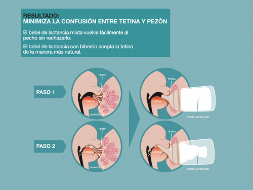 El biberó incorpora una bossa anticòlic patentada que funciona de la mateixa manera que ho fan les glàndules mamàries: